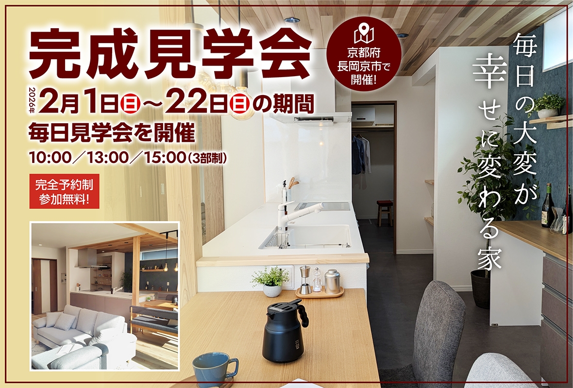 お知らせ[一覧] 健康住宅・木の家[能見工務店]トップページ お知らせ[一覧] 【毎日の大変が幸せに変わる家】完成見学会開催のお知らせ@長岡京市 【毎日の大変が幸せに変わる家】完成見学会開催のお知らせ@長岡京市 2026年02月02日 お知らせ一覧に戻る 2月完成見学会開催!毎日の大変が幸せに変わる家詳しくはこちらから PREV お知らせ一覧に戻る NEXT