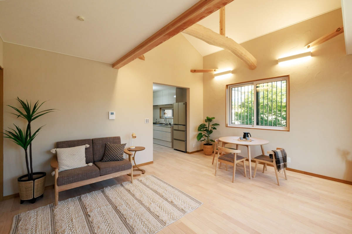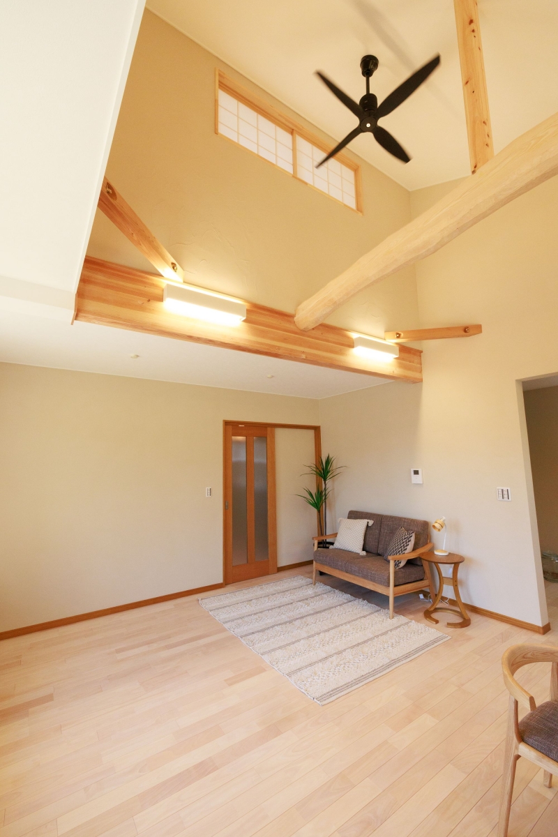 吹き抜けのあるリビングは、松の丸太梁が印象的な開放感あふれる場所。上下階をゆるやかにつなぎ、家族の気配を感じながらも、それぞれが心地よい距離感で過ごせるよう計画しました。